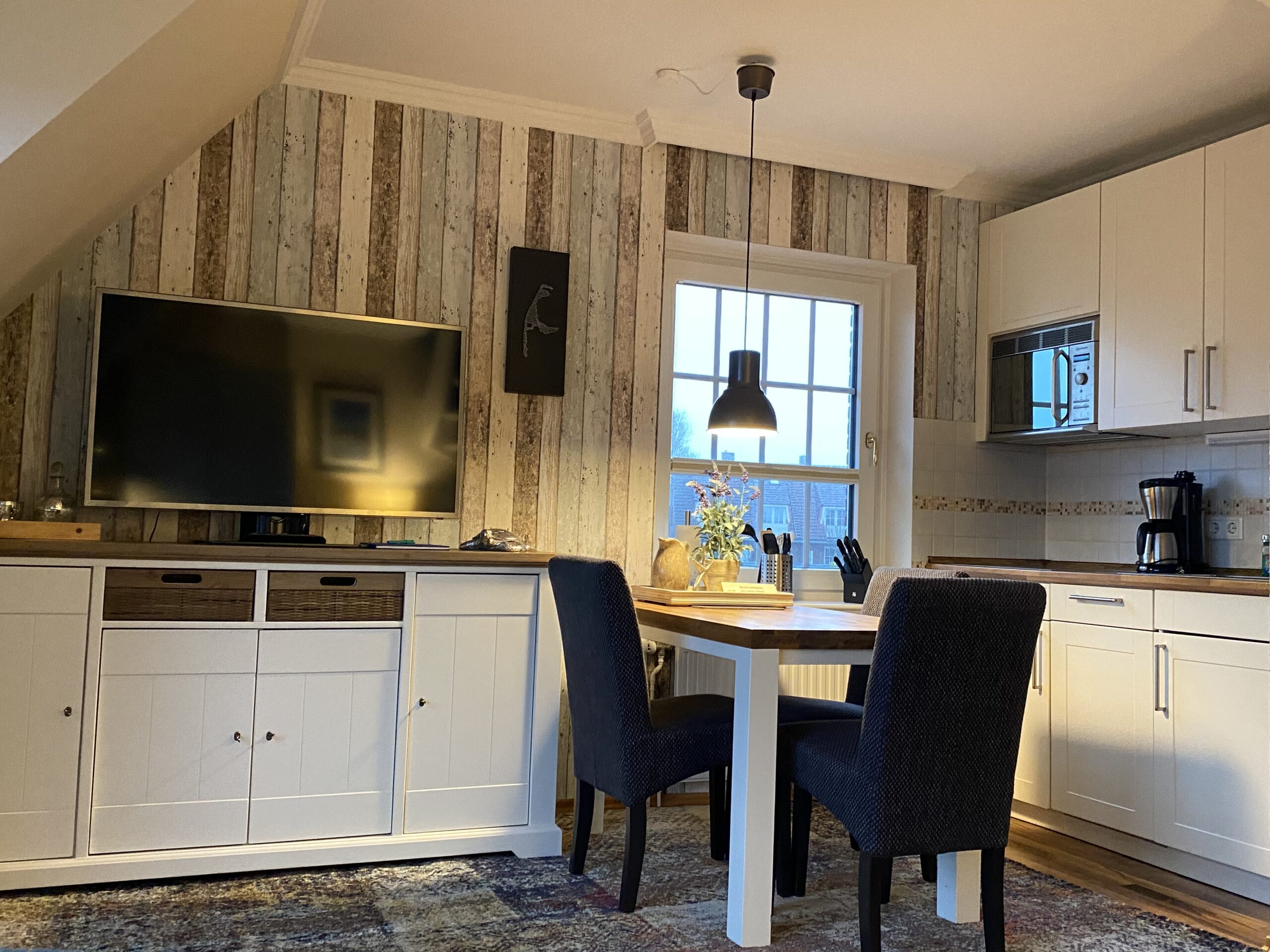 Die offene, cremefarbene Einbauküche fügt sich harmonisch in den Raum ein und bietet modernen Komfort mit einem Geschirrspüler, einem 4-Platten-Cerankochfeld, einem Kühlschrank mit Gefrierfach sowie einer Mikrowelle mit Backfunktion.